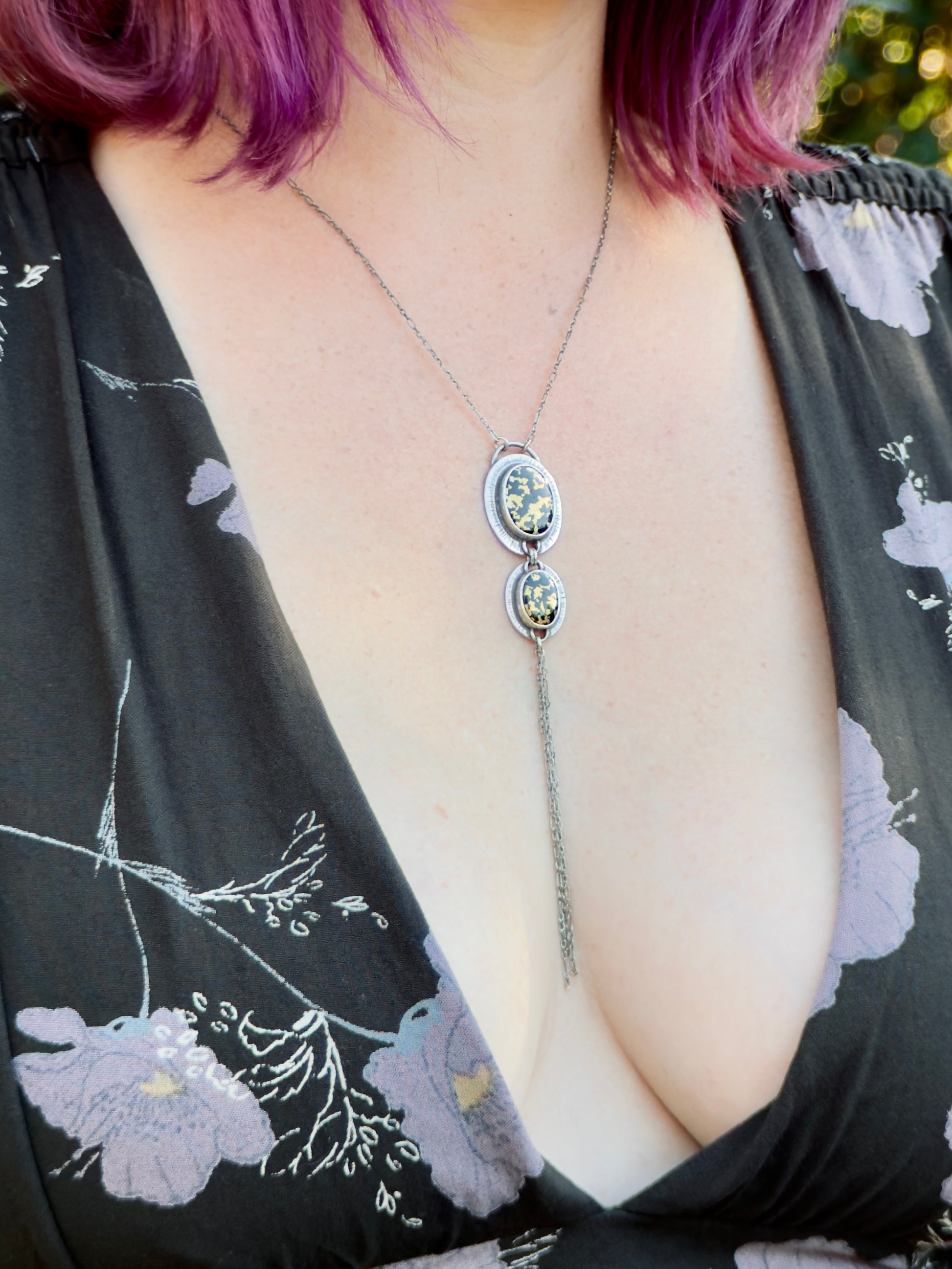 This contemporary pendant features two goldenite gemstones, their rich earthy shimmer enhanced by a sleek sterling silver setting. Delicate silver chains extend gracefully from the base of the pendant, adding movement and a modern sculptural touch. With its balance of natural texture and refined design, this piece is both versatile and striking—an elegant expression of organic beauty.